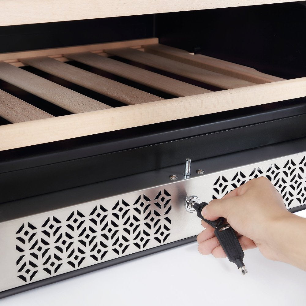 This wine refrigerator can hold up to 160 standard 750ml bottles or 55 Magnum bottles, making it a strong choice for collectors needing maximum flexibility. Removable racks, high-performance cooling fans, and a secure locking system ensure your wines stay safe, stable, and perfectly chilled at all times.