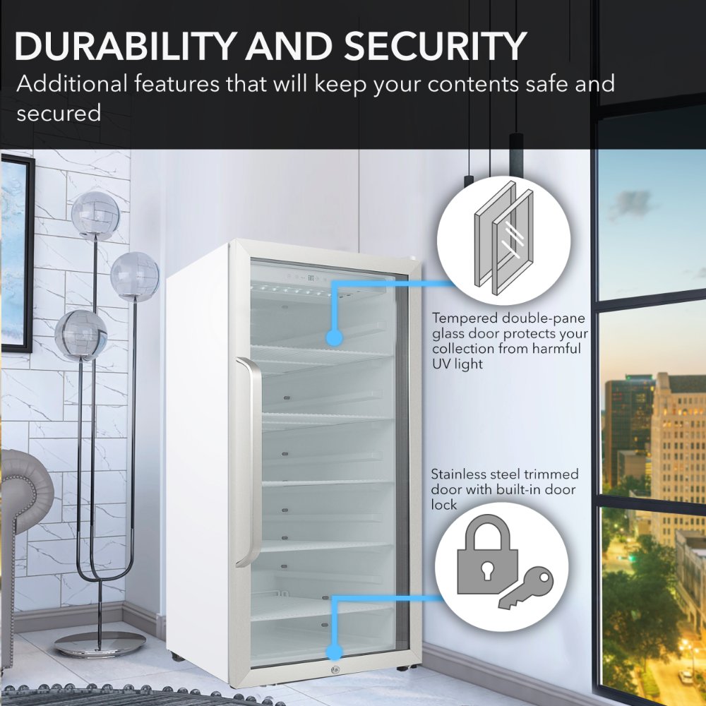 | Design | Sleek white cabinet with stainless steel trimmed glass door |