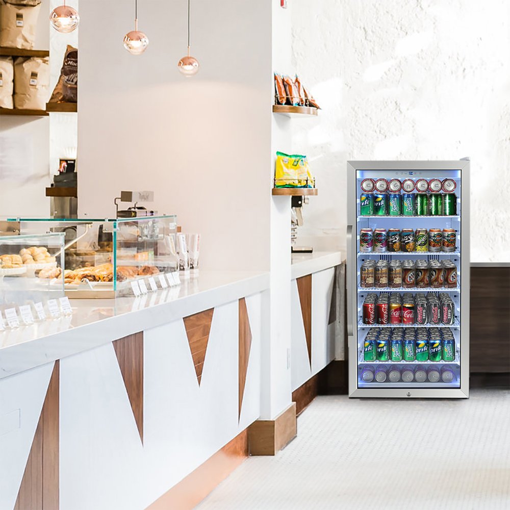 I have 2 of these in my store and it holds mostly sodas and beers. The lighting on the door makes everything very visible. The capacity is also good for a small store. Very impressed with this brand and the value for this type of refrigerator