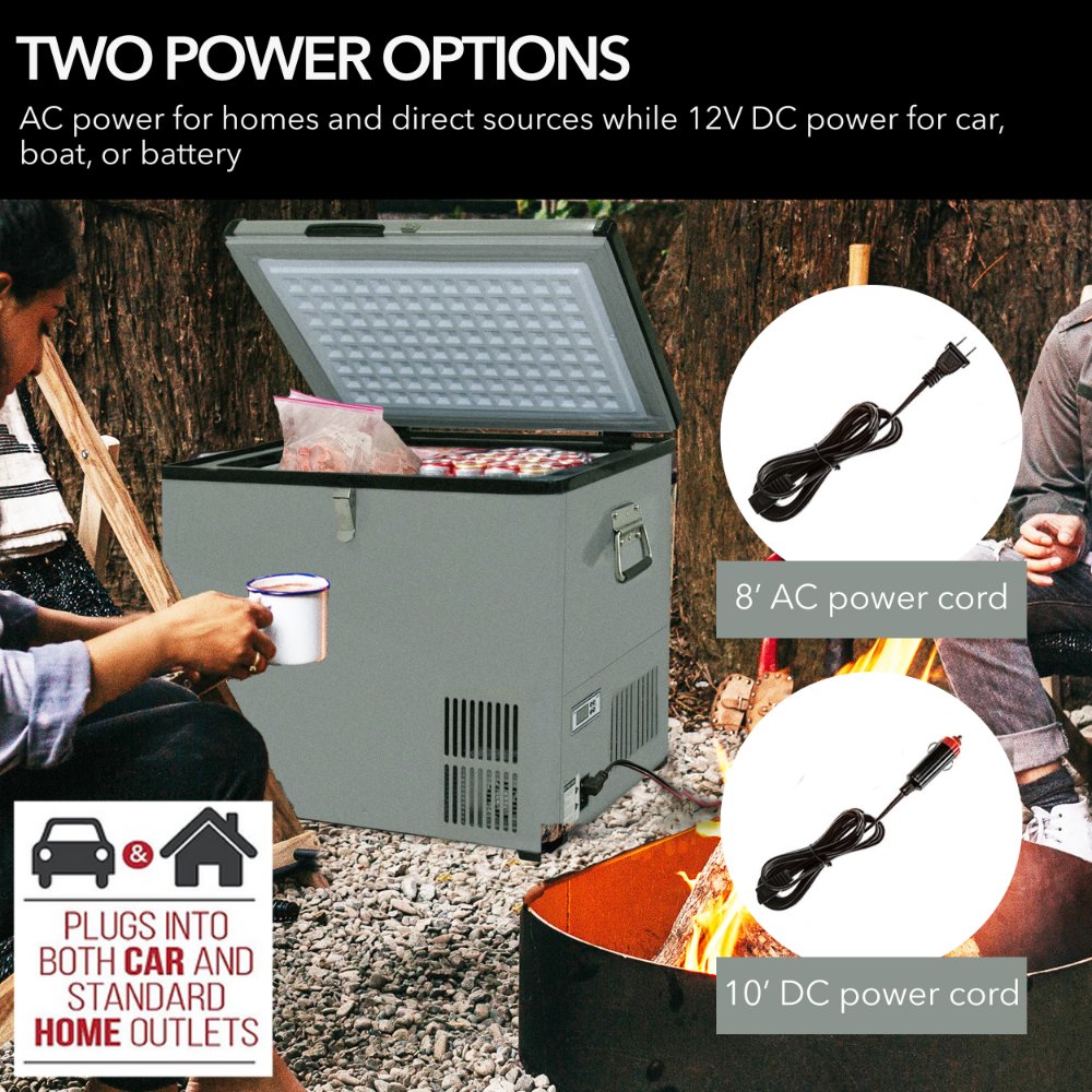 The Whynter FM-65G Portable Fridge / Freezer provides versatile cooling and freezing in a portable, high-quality design. Perfect for RVs, boats, campsites, or any outdoor excursion, this unit operates on both AC (115V) and DC (12V/24V) power sources, making it convenient for travel or remote locations. With a 65-quart capacity, it can store up to 107 standard 12 oz cans, making it ideal for day trips, camping, or extended adventures.