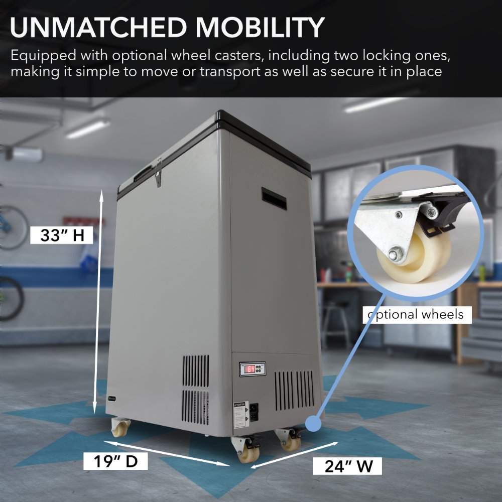 Designed for mobility, this freezer features optional wheeled casters for easy transport, two of which lock for stationary stability. Its dual power options, including 12V DC and 115V AC, ensure flexible applications, whether for home, camping, or on-the-go use. With a Fast Freeze mode and adjustable temperature control, you can maintain optimal storage conditions for different types of items.